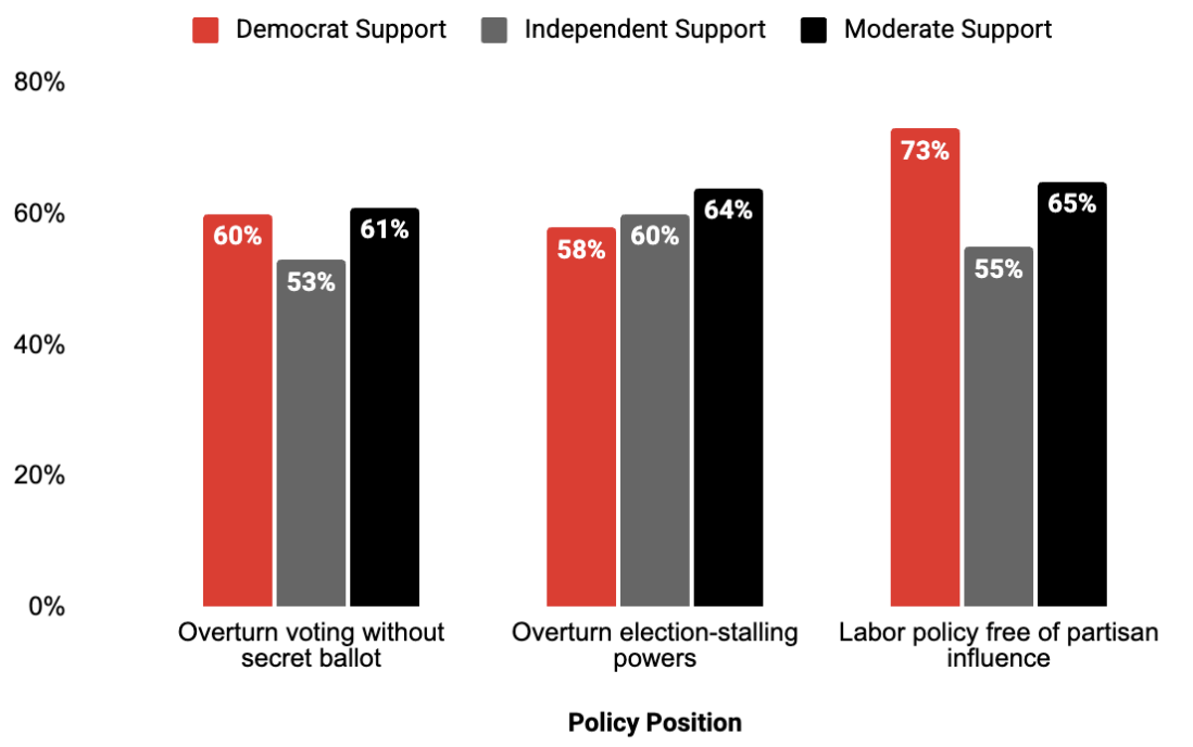 Similarly, 61% want to overturn the ability of union bosses to stall scheduled elections if they know they are about to lose. This result is consistent across ideological lines - 64% of Moderates, 56% of Very Conservatives, and 53% of Very Liberals all agree: election-stalling is indefensible.